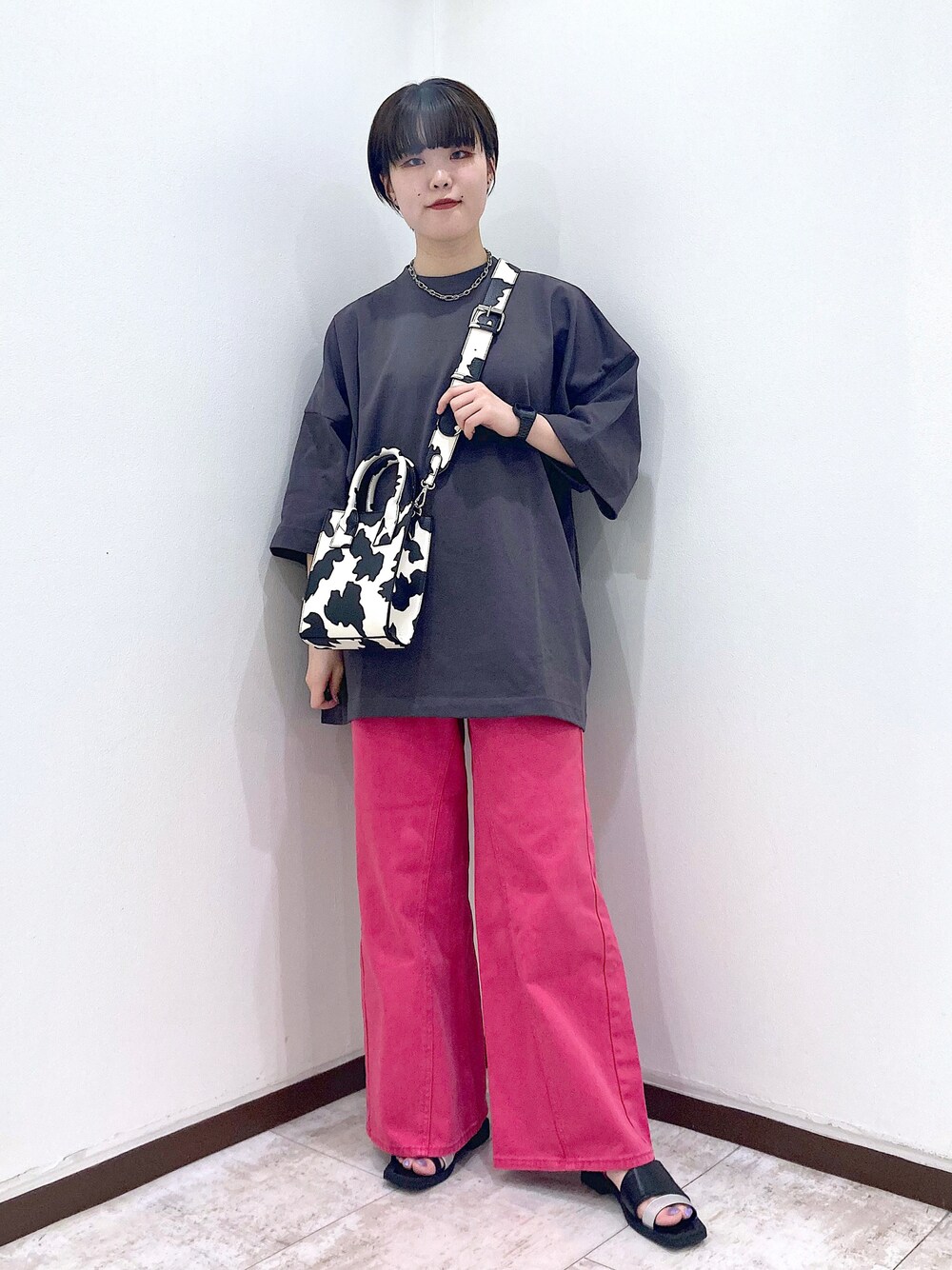 シンプルカラーコーデ 明るめなカラーでも、落ち着いたカラーと合わせることで、大人っぽい印象に! 地味になりすぎないように、柄のバッグでアクセントをプラスしました!