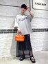 トレンドママコーデ メッシュのトレンドを入れたママ風コーデです! ブラック×グレーの落ち着いたカラーに、オレンジのバッグを合わせて差し色に!◎◎ 動きやすさとオシャレ感を兼ね備えたコーデです!
