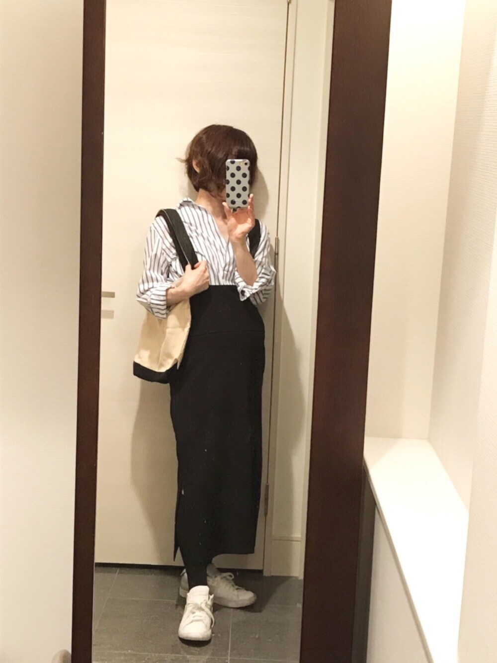 妊娠8カ月。 サロペットスカートが楽チンです。 夏にはお腹つっかえずにサラッとTシャツ合わせしたい〜その余裕があれば…。 ニコアンドのストライプシャツ、ストライプ具合がとてもお気に入りです。 しかもプチプラ╰(*´︶`*)╯♡
