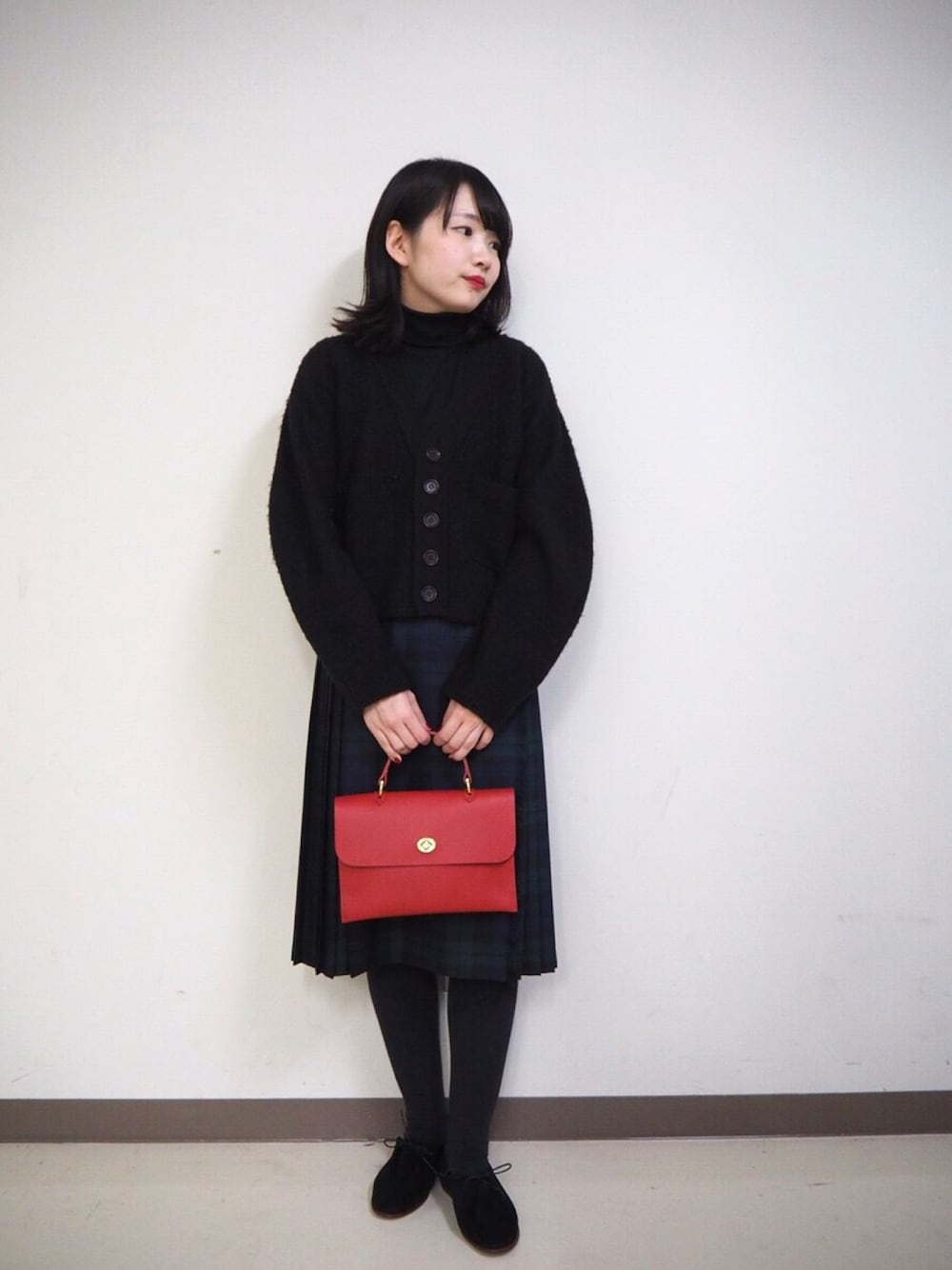 Mimi定番モデルの『HEBE』は、ハンドバッグとショルダーバッグの2WAY仕様。発色の良いレッドカラーが冬のスタイリングにアクセントを。