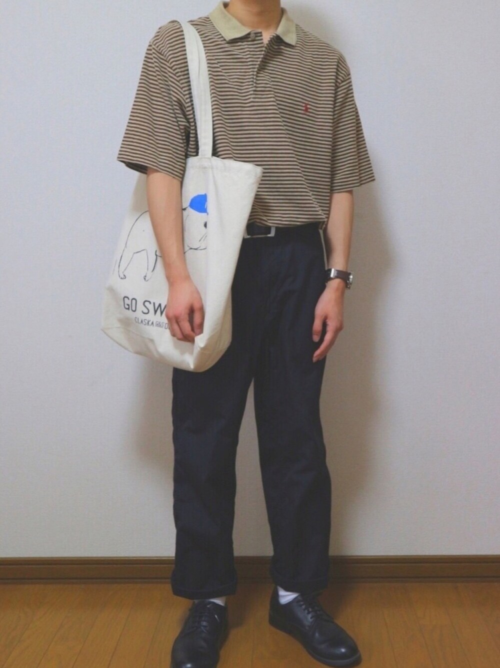 古着コーデです‼︎ このポロシャツお気に入り!黒のワイドパンツと革靴でうまく可愛さを中和できたかなと思います。 良きと思ったらいいね👍&フォローお願いします🤲