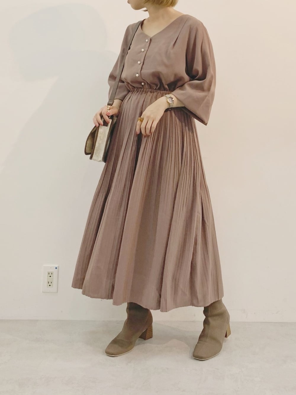 ワンピースとブーツを同系色にして スタイルアップ効果を狙いました 柄小物でのっぺり防止も💭 ---------------------------------- ◉one-piece サイズ感:ゆとりあり 素材感:秋から、コートやニットと合わせれば冬まで着られそうな素材 着心地:ウエストゴムで楽に着られるの綺麗見えで、袖の上げ下げ・前後で印象を変えてたくさん着回しができそうです ---------------------------------- Instagram ☞ ymgc__6