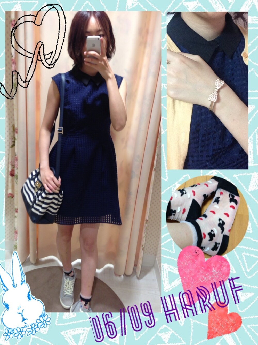 襟付きワンピはスニーカーでもいけます。 シースルーの靴下はネコ柄(ΦωΦ) ブレスレット:Forever21 カーデガン:UNIQLO