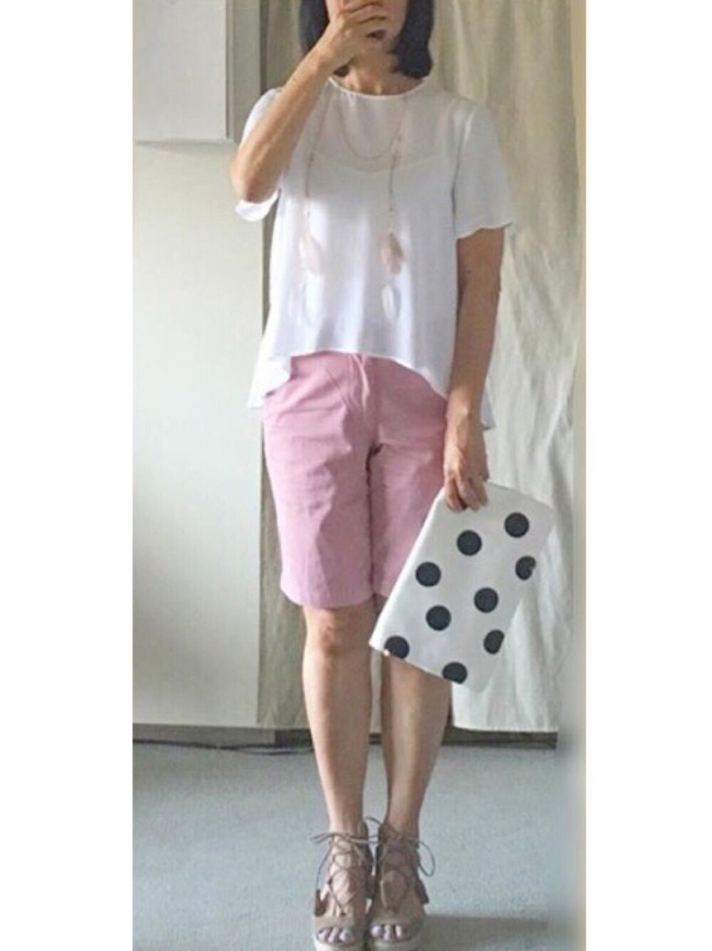 ユニクロメンズでピンクのハーフパンツを見つけました。 夏休みの小学生 ぽくなり過ぎないようにトロミTブラウスとフェザーのネックレス、レースアップサンダルを合わせましだが、ポーズがイマイチです😂