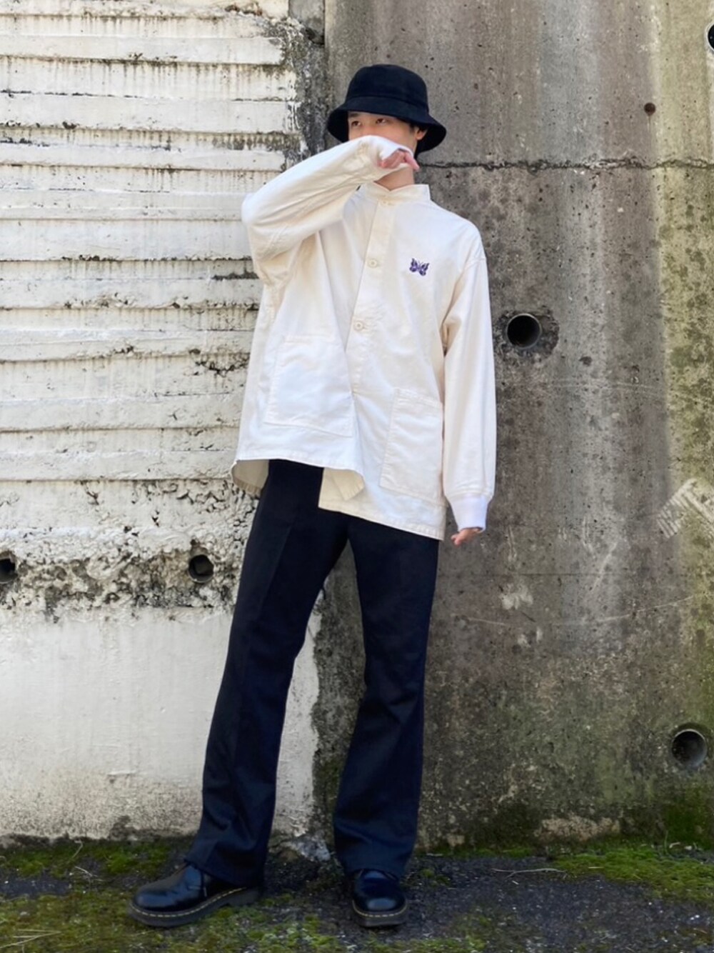 Needlesの蝶々のワンポイントが可愛いアーミーシャツとフレアスラックスの組み合わせ! お気に入りお願いします!!