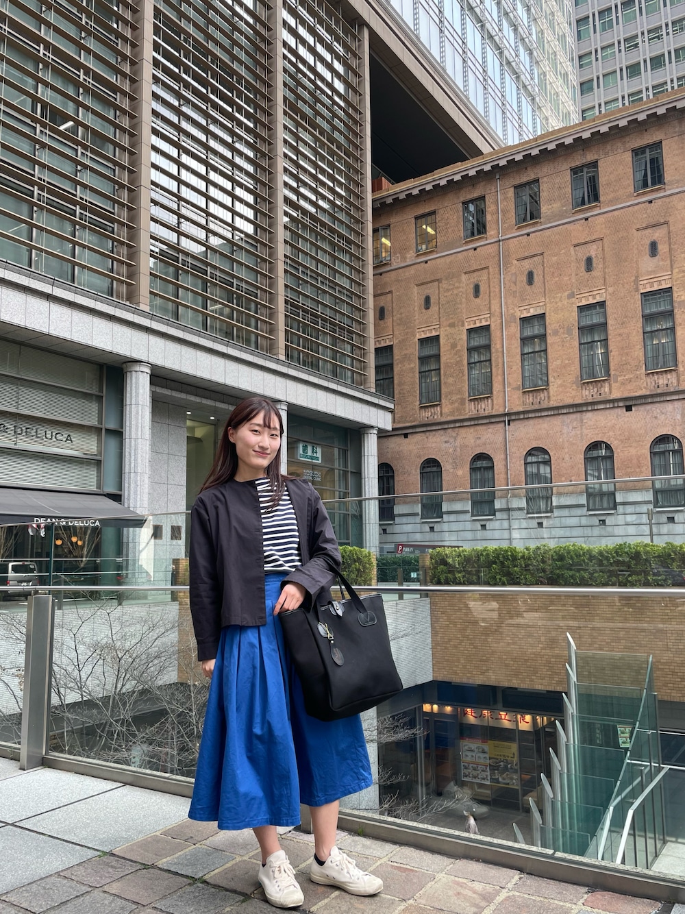 暖かくなってきたので、タイツを卒業し、ブルーの明るいスカートを履いてみました☺️ 新入りのブレディのバッグとも相性が良くて気に入っています❤️