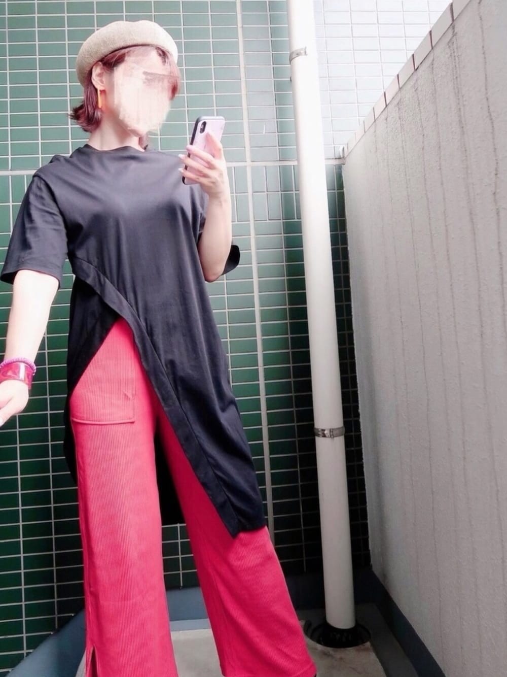 お気に入りのTシャツワンピにGUのパンツを合わせました。 GUのパンツラクチンなので色違いでゲット😊 ベレー帽は夏用購入!リネン素材で涼しげです✨