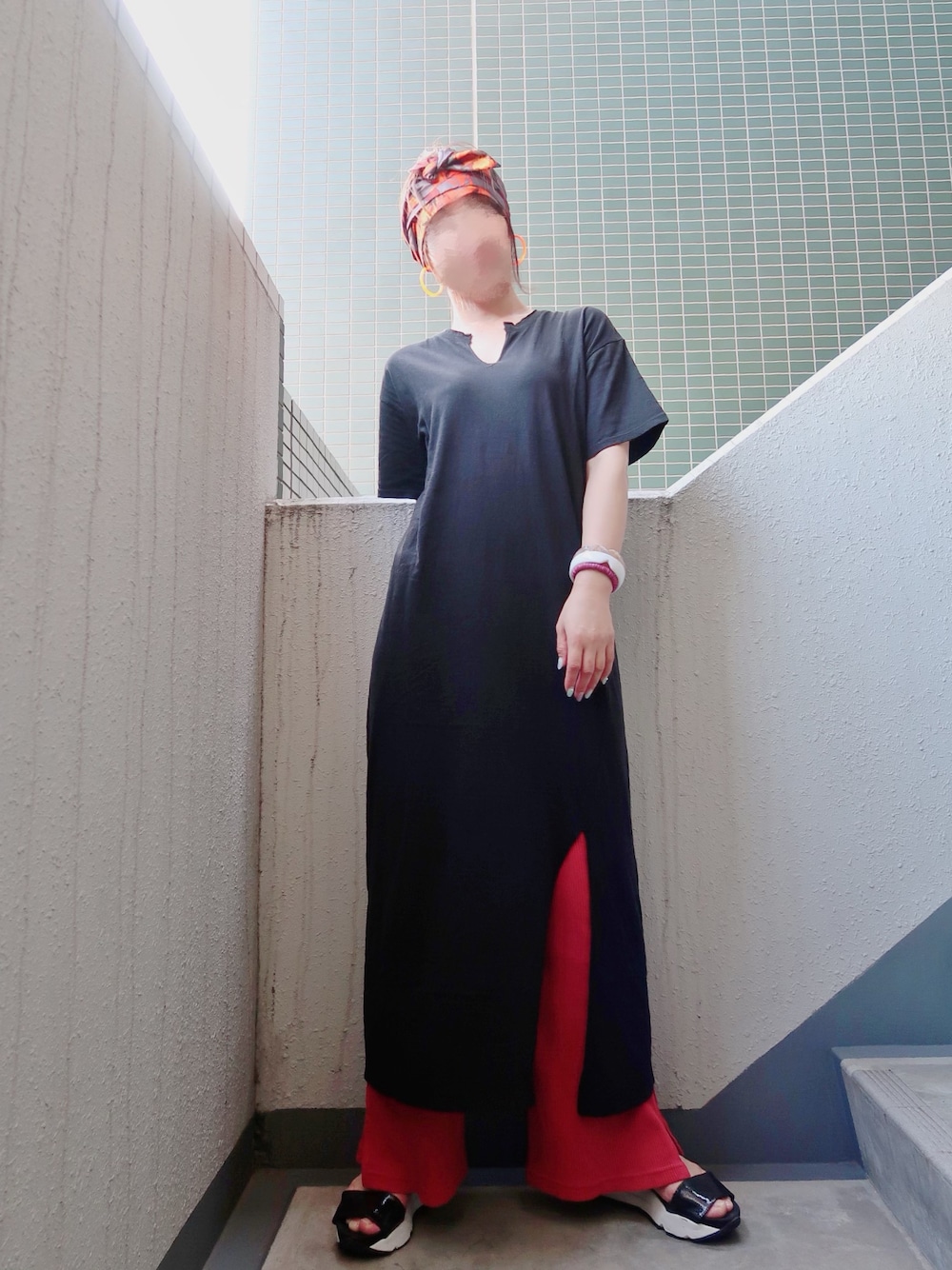 ヘアターバンは初挑戦😊 服は無地でUngridのワンピと GUのパンツでラフな感じにしました!! なんか階段で写真とるとやたらあおりぎみになってしまう…段差ないとこなのになんで😂