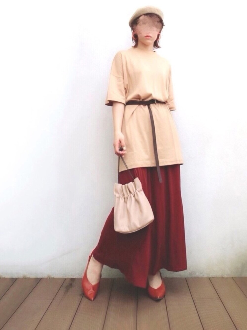 ベージュとブラウンでまとめて みました☆ ビッグシルエットのTシャツはベルトで シルエット調整😁 巾着バッグが可愛いくて 気に入ってます✨
