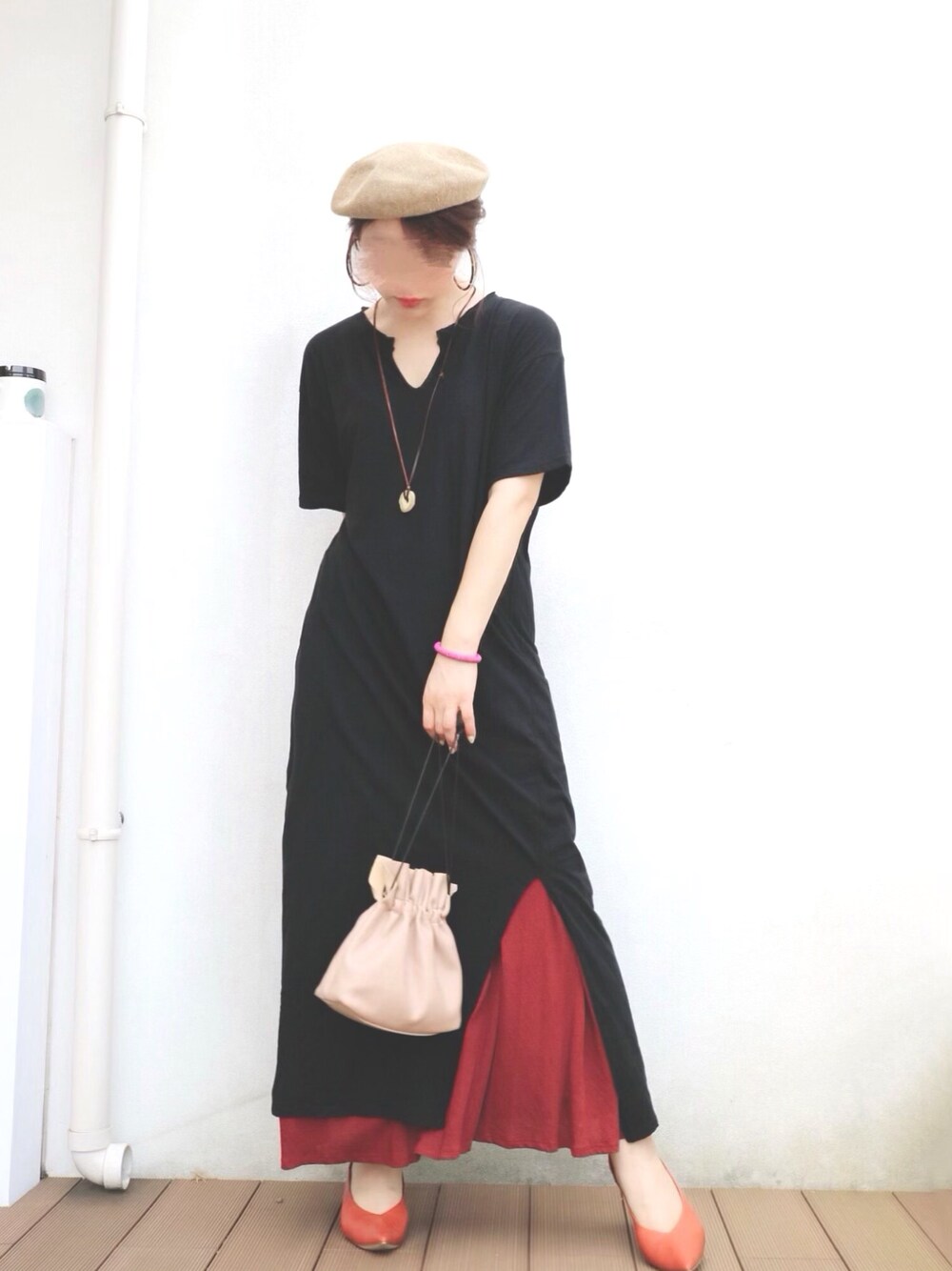 ブラックのロングワンピと ブラウンのスカートの レイヤードスタイル😊