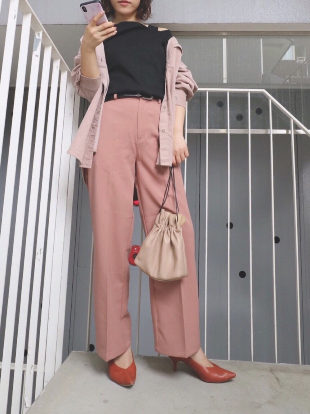 ベージュ+くすみピンク+ブラウン。 チャオパニックのセンタープレスパンツ スッキリ見えして足長効果ありだぁ✨