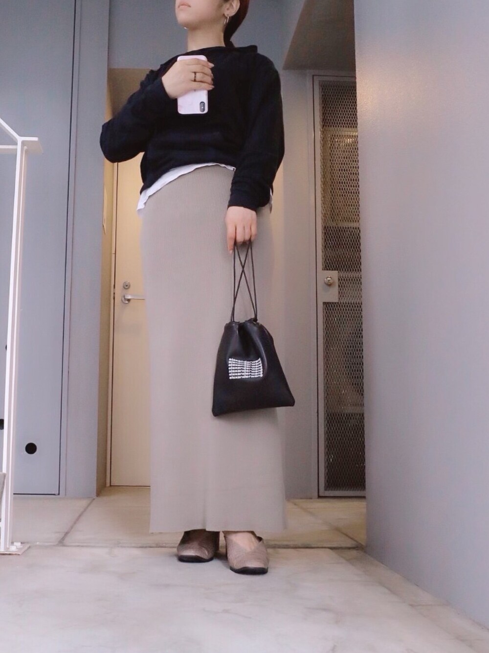 パーカーとニットのロングスカート。 ラフなコーデにちょっとレディライクな組み合せ😊
