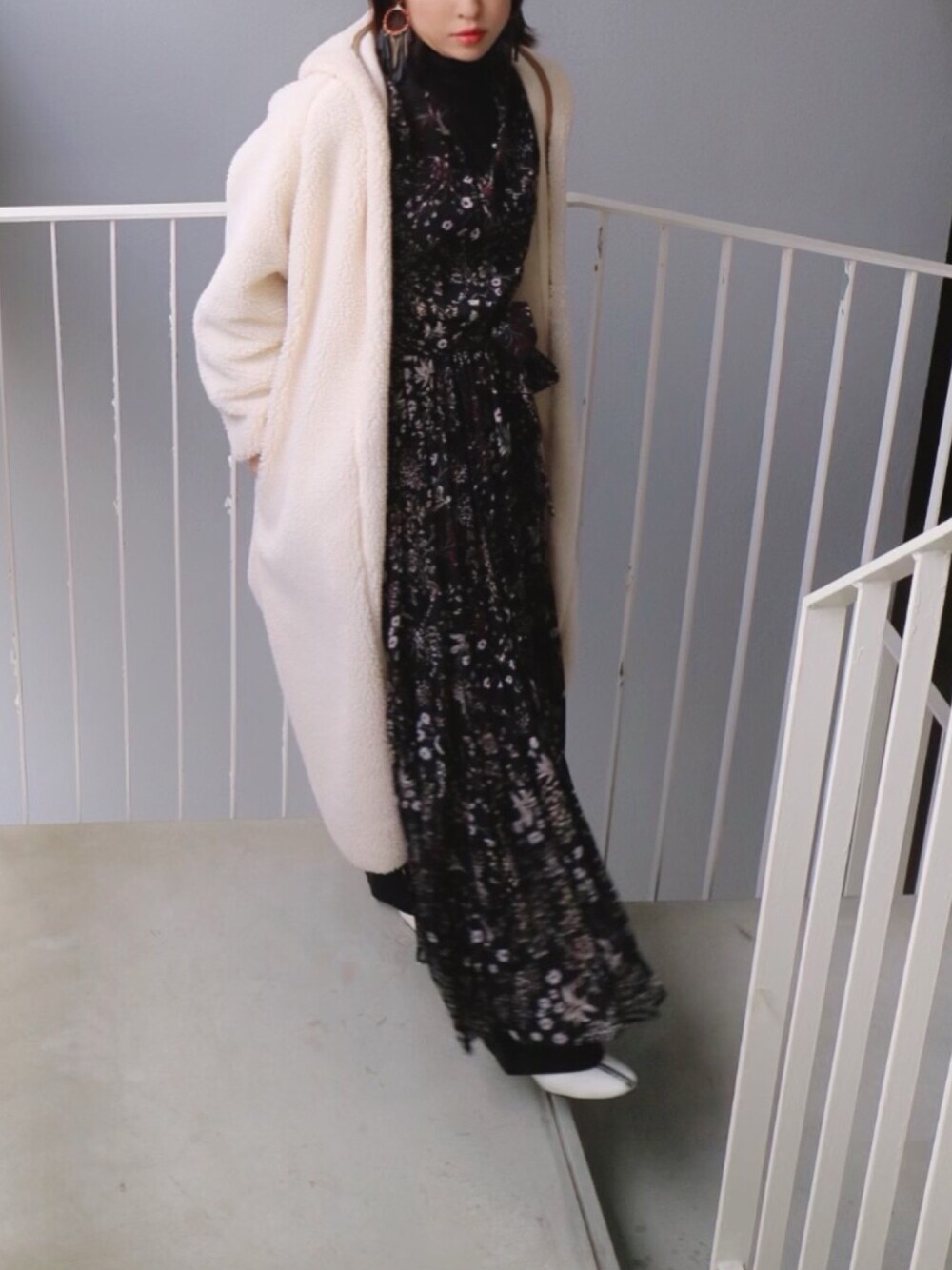 カーサフラインの マキシワンピは 超美シルエットで お気に入りです☺️ カジュアルなボアコートと 合わせてみました😆