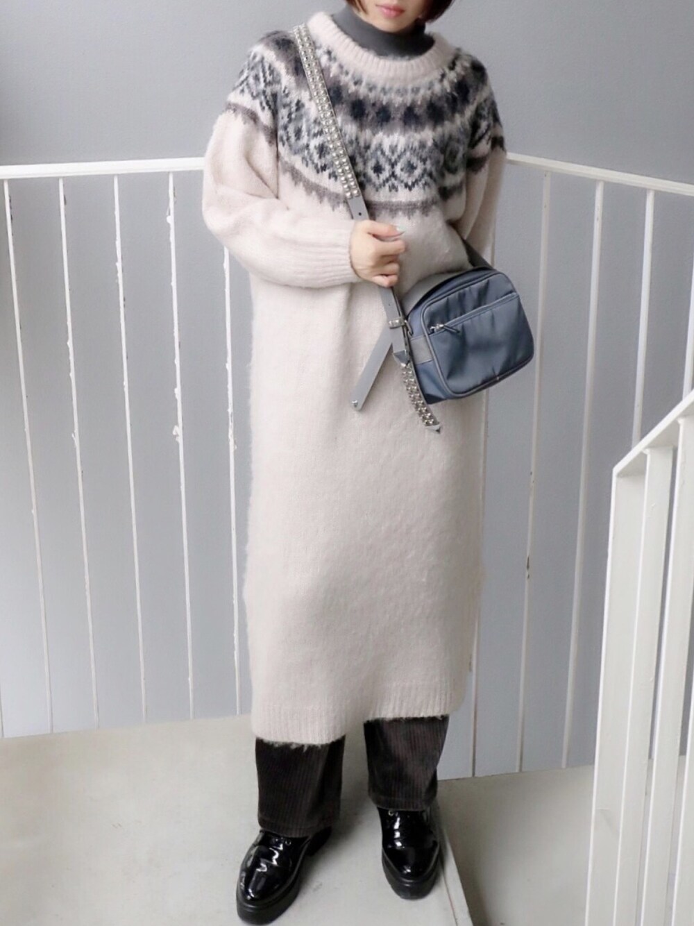 グレーのニットワンピを主役に ワントーンコーデ😊 ノルディック柄のニット、 今年は迷った末にワンピースに してみました‼️