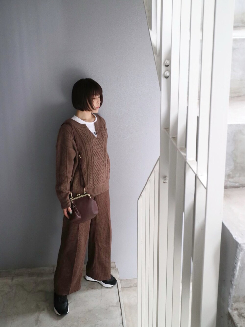 ブラウンコーデの ポイントはガマグチバッグ