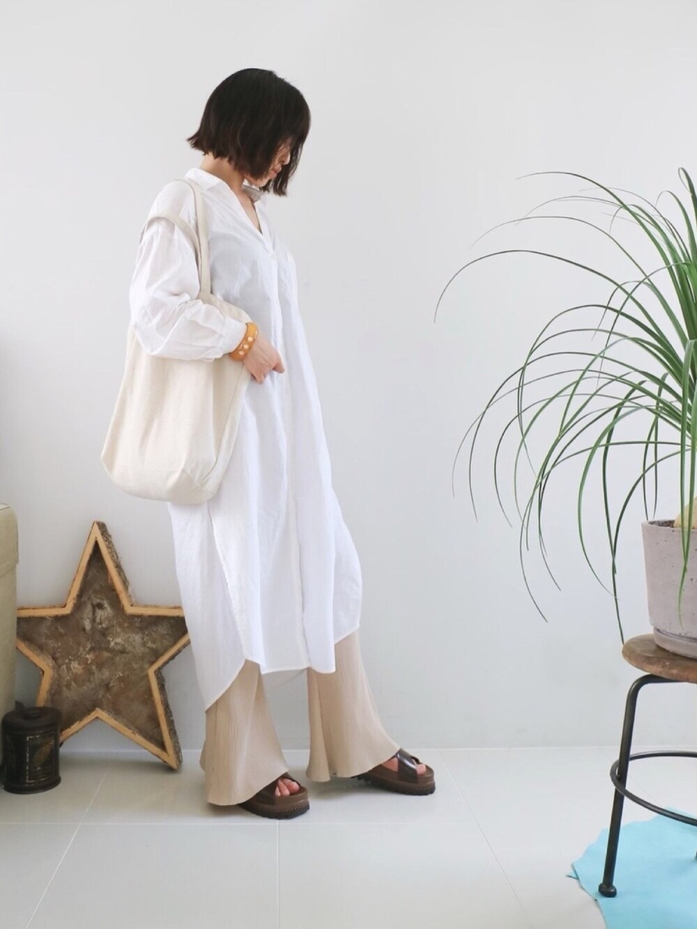 シャツワンピで ホワイトコーデ😆 フレアパンツとサンダルで ラフな感じに