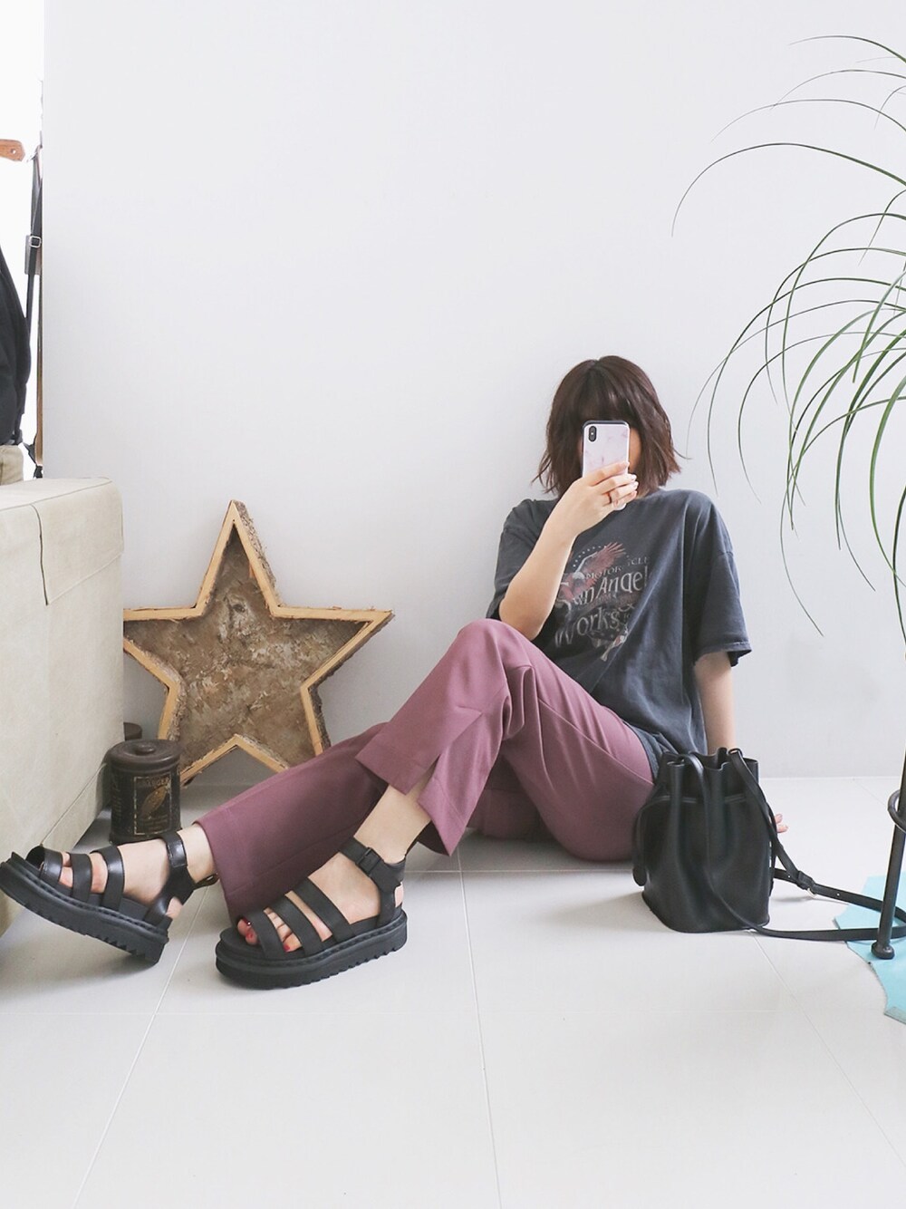 オーバーサイズの プリントTシャツが最近お気に入り 足元はマーチンサンダルで ラフな感じ