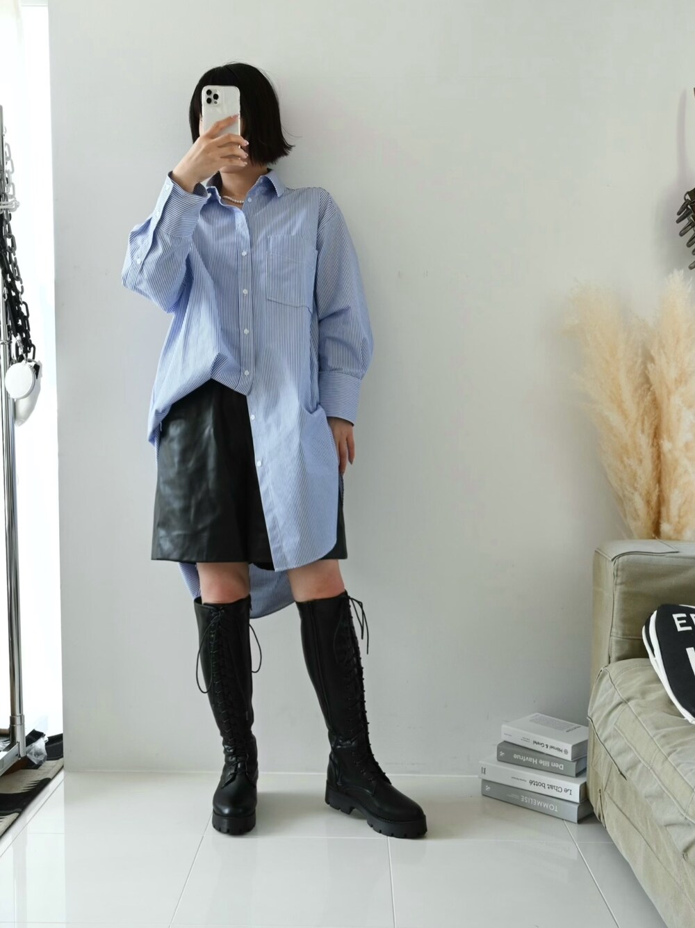 オーバーサイズシャツと ロングブーツのコーデ。 ZARAのオーバーサイズシャツは ホワイトも購入してめっちゃ活躍してます。 ちなみにパンツもZARA。