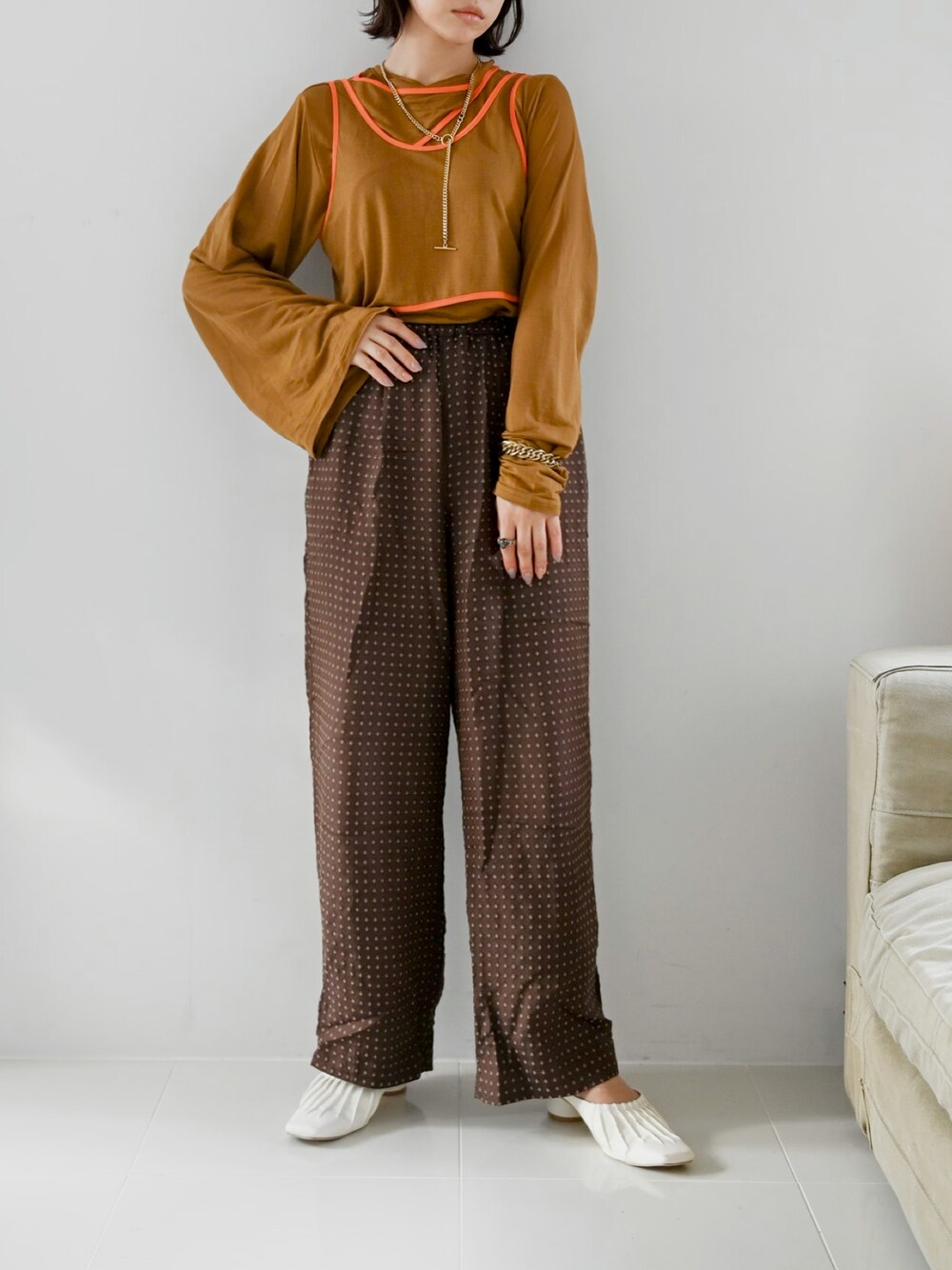 トップスのレイヤードがお気に入り アシメの袖も可愛いんです🤎