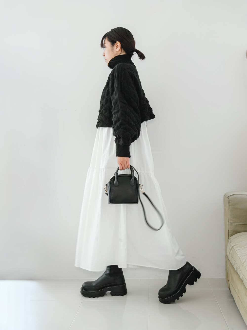 ハーフジップのニットは いい感じのショート丈で レイヤードスタイルに最適。 ワンピと合わせて モノトーンにしてみました。