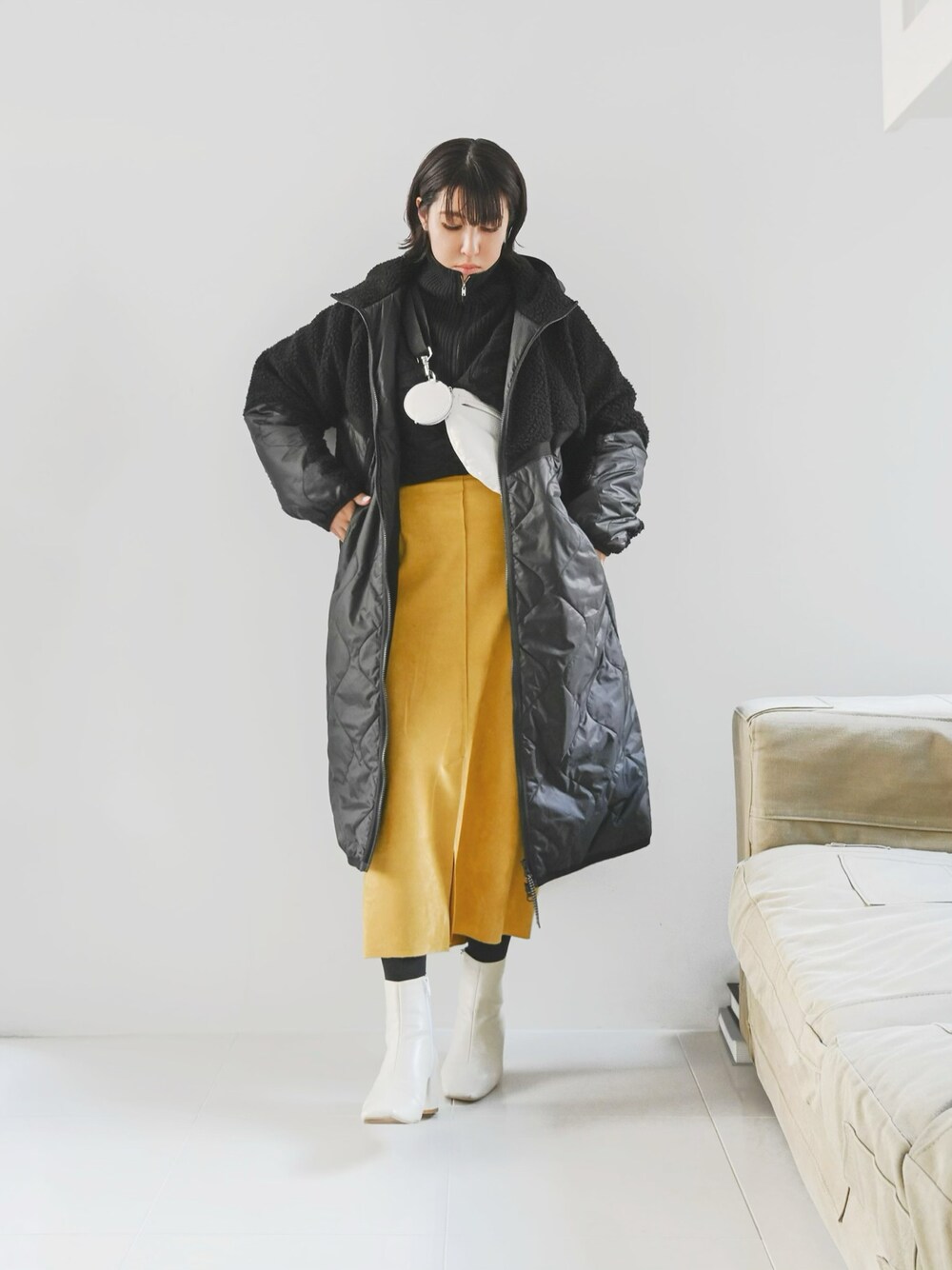 ボア×キルティングのコートは カジュアルなデザインが お気に入り そして久しぶりにスカート はいてみました。