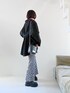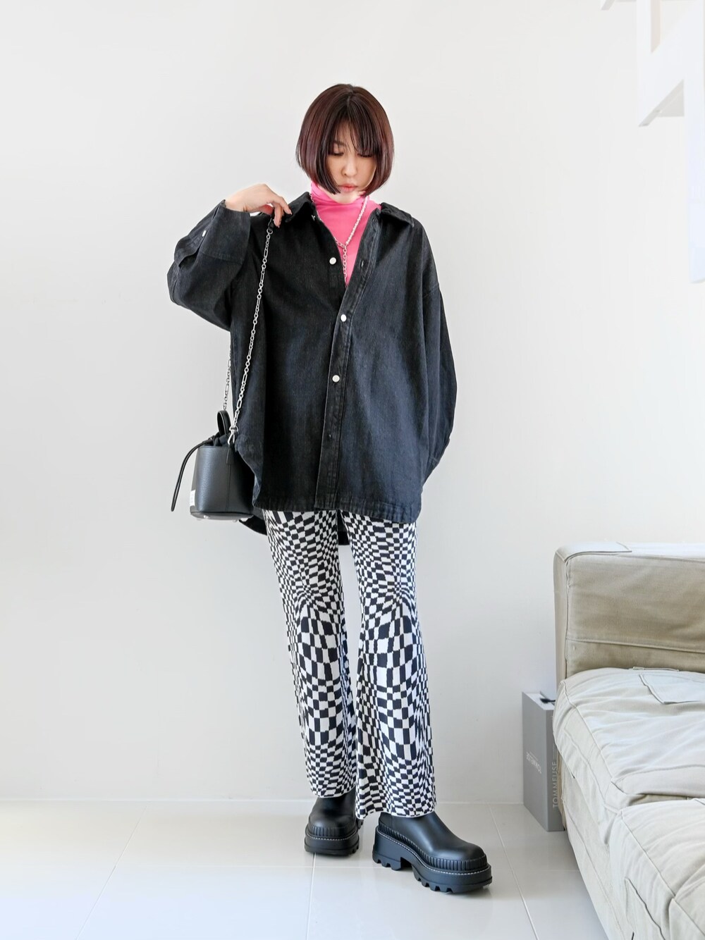 オーバーサイズのデニムシャツ バッグがレースアップになってて可愛い ブラックデニムだと甘くなり過ぎず ビビットなカラーも合わせやすいです