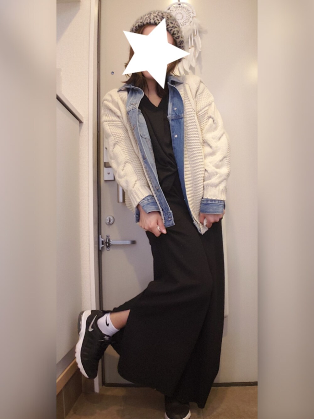 やってみたかデニムジャケットにカーデ☺️ なかなかボリューミーなコーデになってしまった。。。