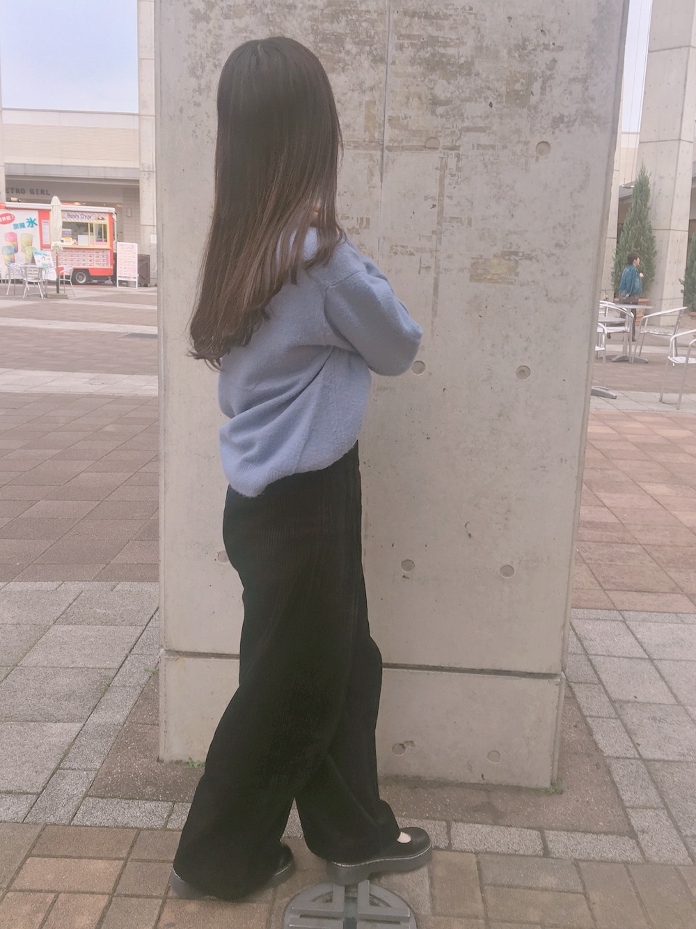 ブルー系のニット/セーター、ブラック系のその他パンツを着用したレディースの秋コーディネートの1枚目の写真