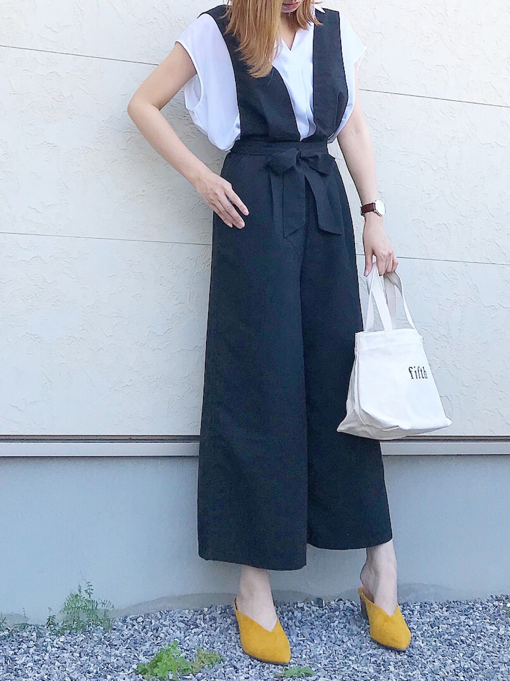 キキのつなぎ/オールインワン「ウエストリボンVネックコンビネゾン」を使ったコーディネート