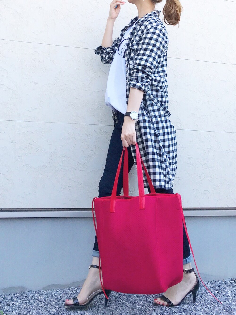ブラックのギンガムチェックのシャツに 赤のq bag !