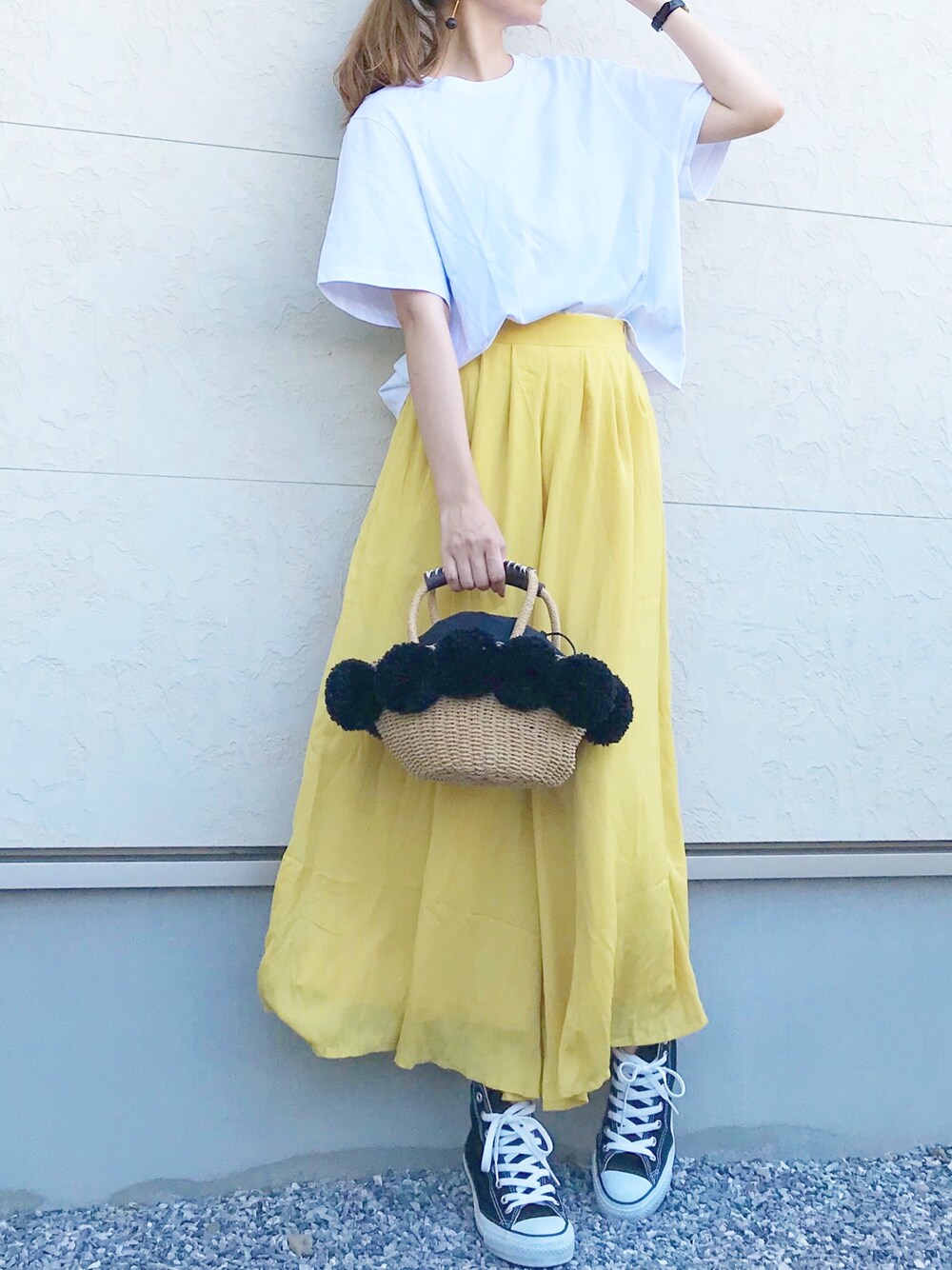 キキのかごバッグ「ポンポン巾着ミニかごバッグ」を使ったコーディネート