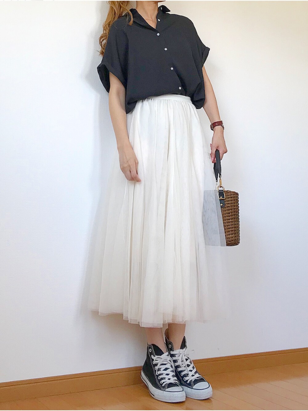 キキのスカート「チュールロングスカート」を使ったコーディネート