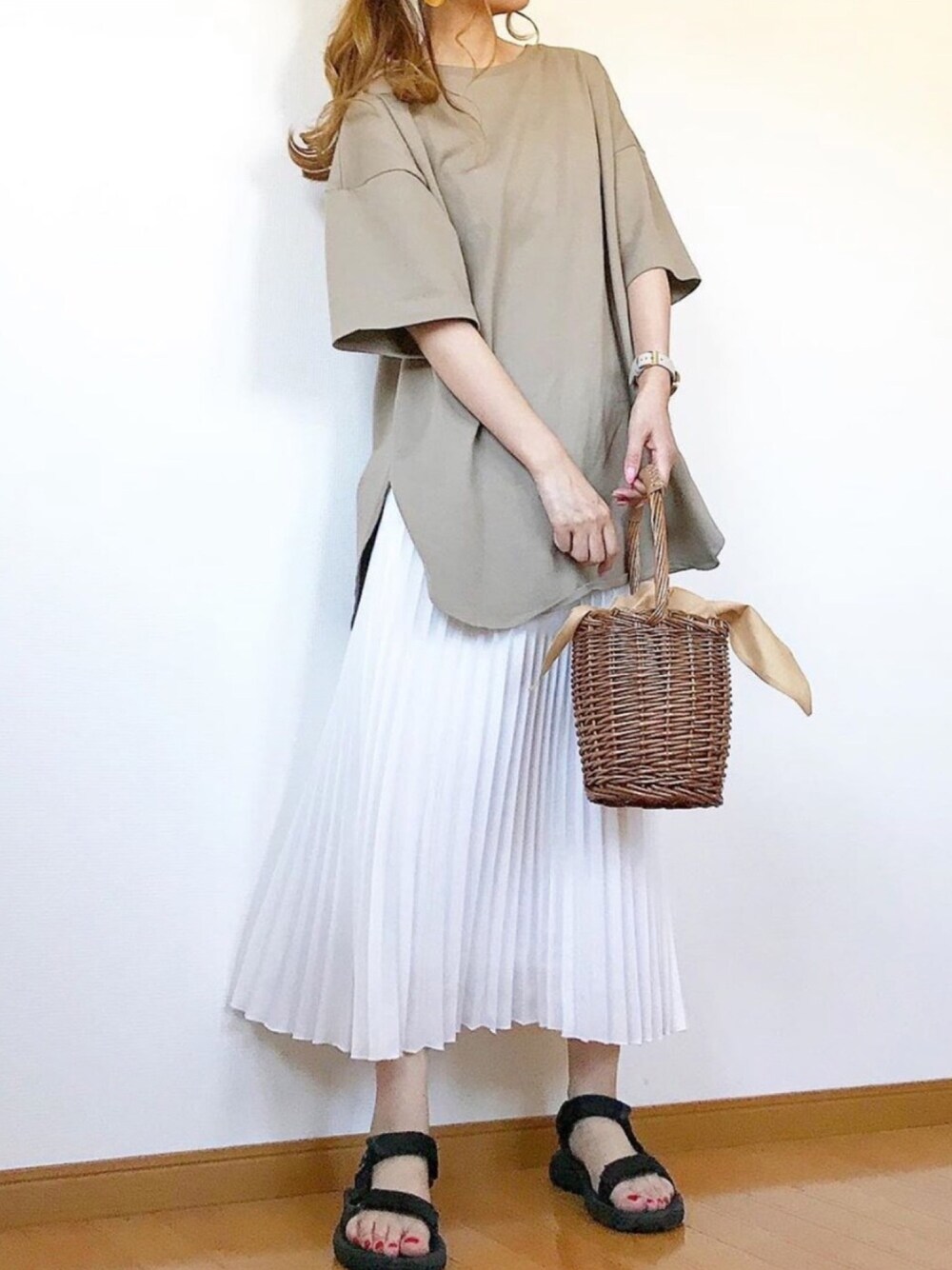 ベージュ系のTシャツ/カットソー、ブラック系のサンダルを着用したレディースの夏コーディネートの1枚目の写真
