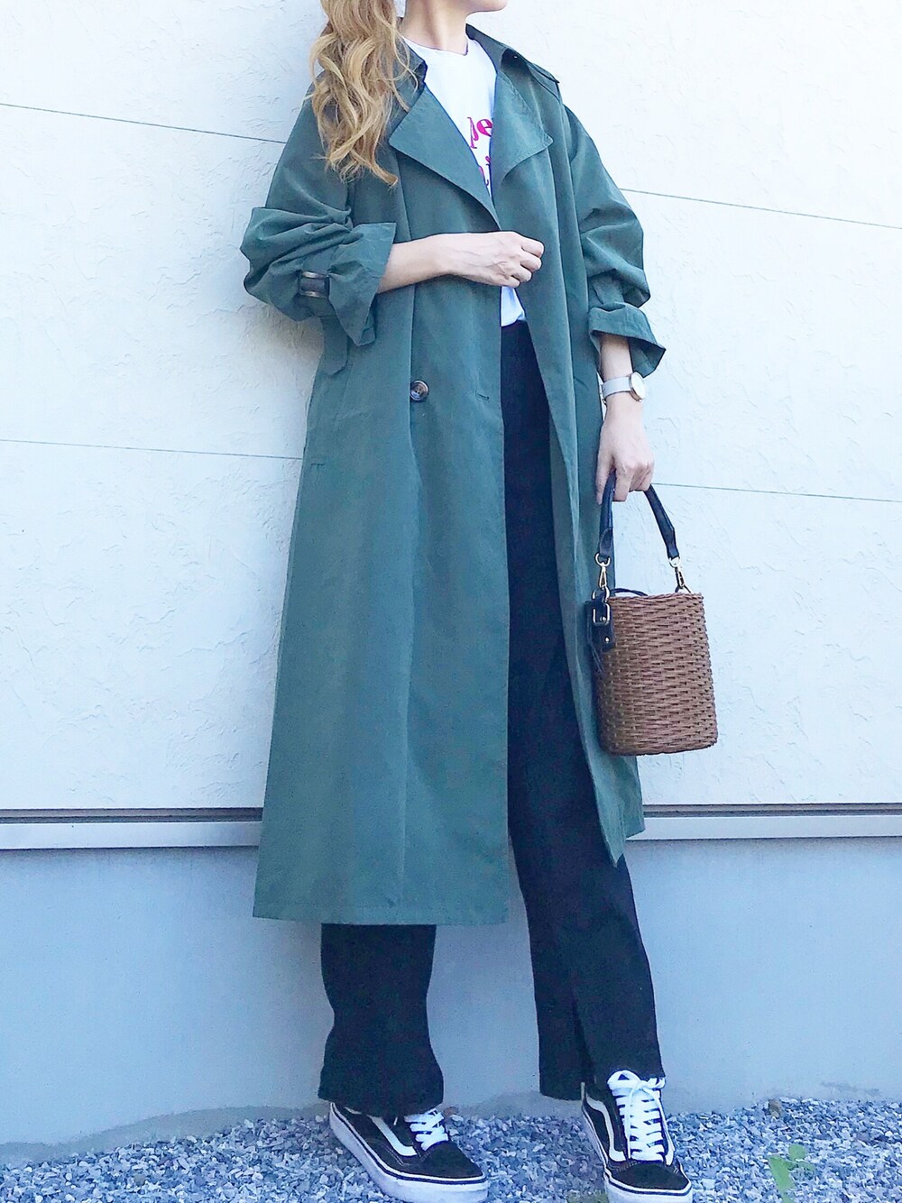 グリーン系のトレンチコートを着用したレディースの秋コーディネートの1枚目の写真