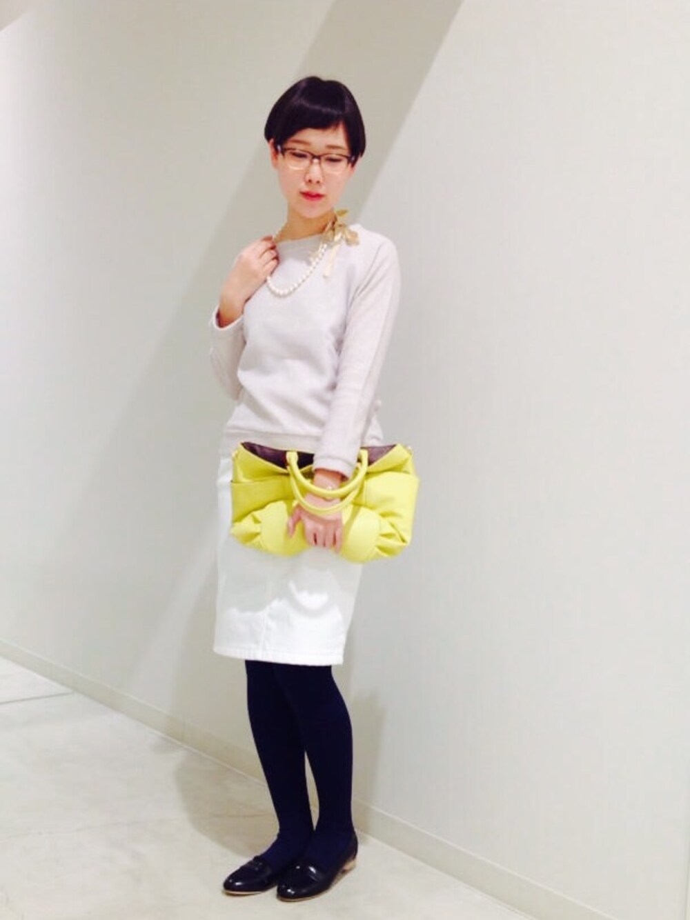 オールikka。 タイツは黒に見えるけどネイビーです。 そういえば、白いタイトスカートが三連続でした笑 商品情報がまだなかったのですが、パールネックレスについたリボンが女の子らしくて可愛いです( ´◇` )