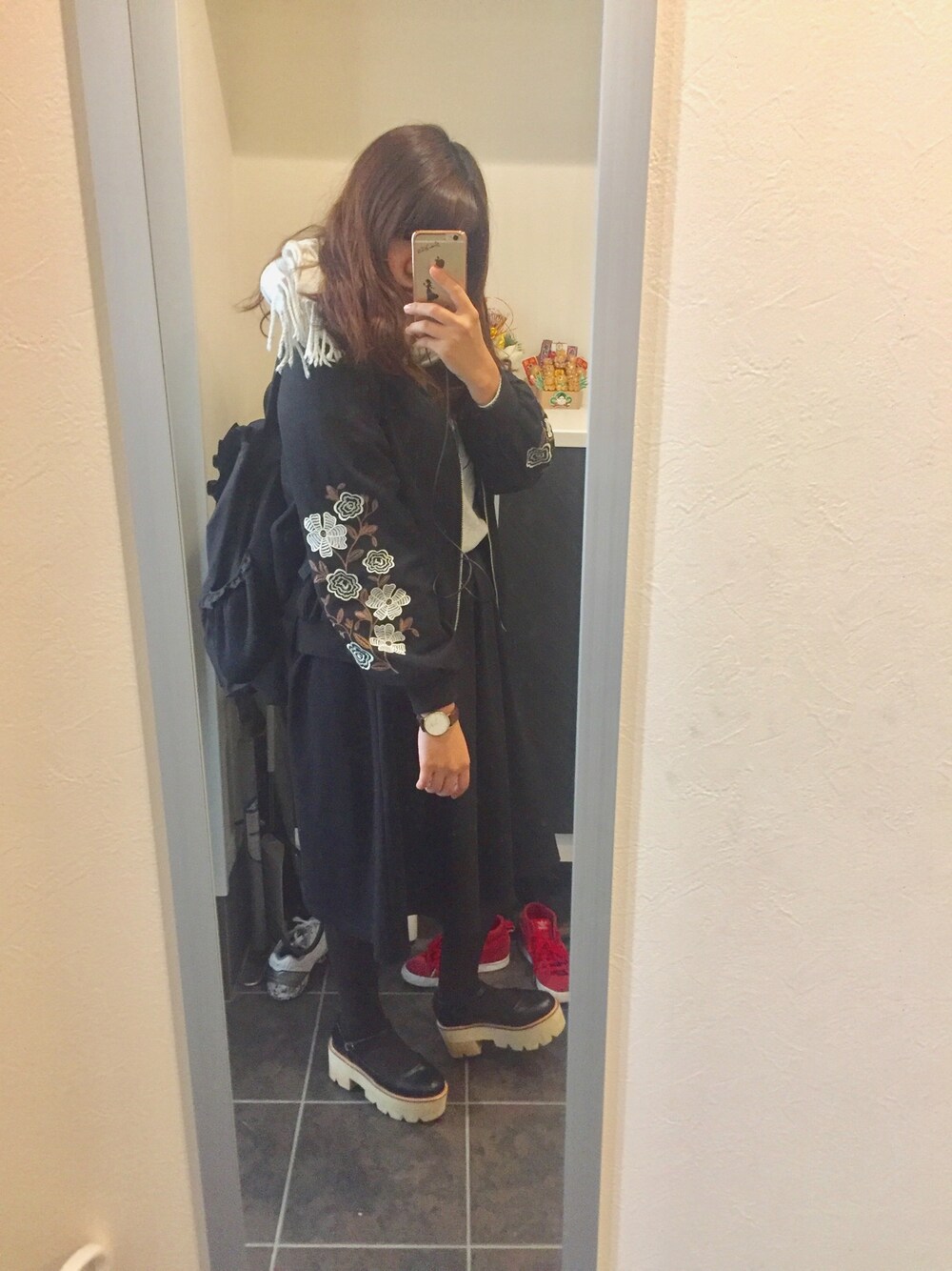 久々の投稿です☺️ この時期は黒を着たくなる…◡̈* そしたら暗くなるのでマフラーは白で! merryjenny のワンストラップシューズは黒だけど足元を軽くしてくれます! あと時計とタイツをブラウンでさりげなく合わせてます☺️