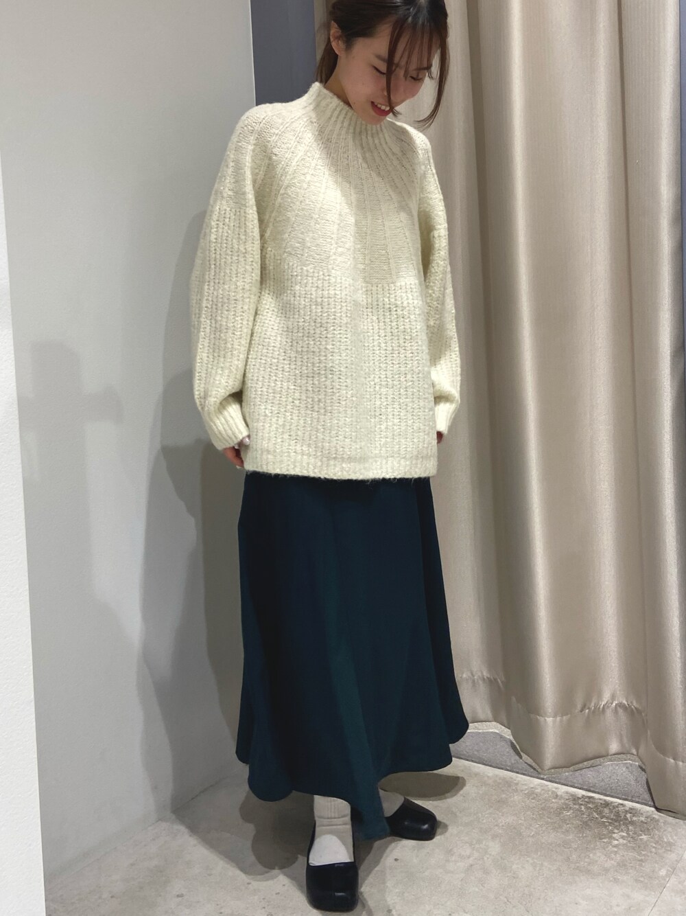 店頭でも大人気のニットに、珍しいグリーンのマーメイドスカートを合わせました☺︎ ニットは苦しくならない浅めのハイネックで着心地抜群! スカートのグリーンはこれ位深い色味だと手を出しやすいですよね🐊