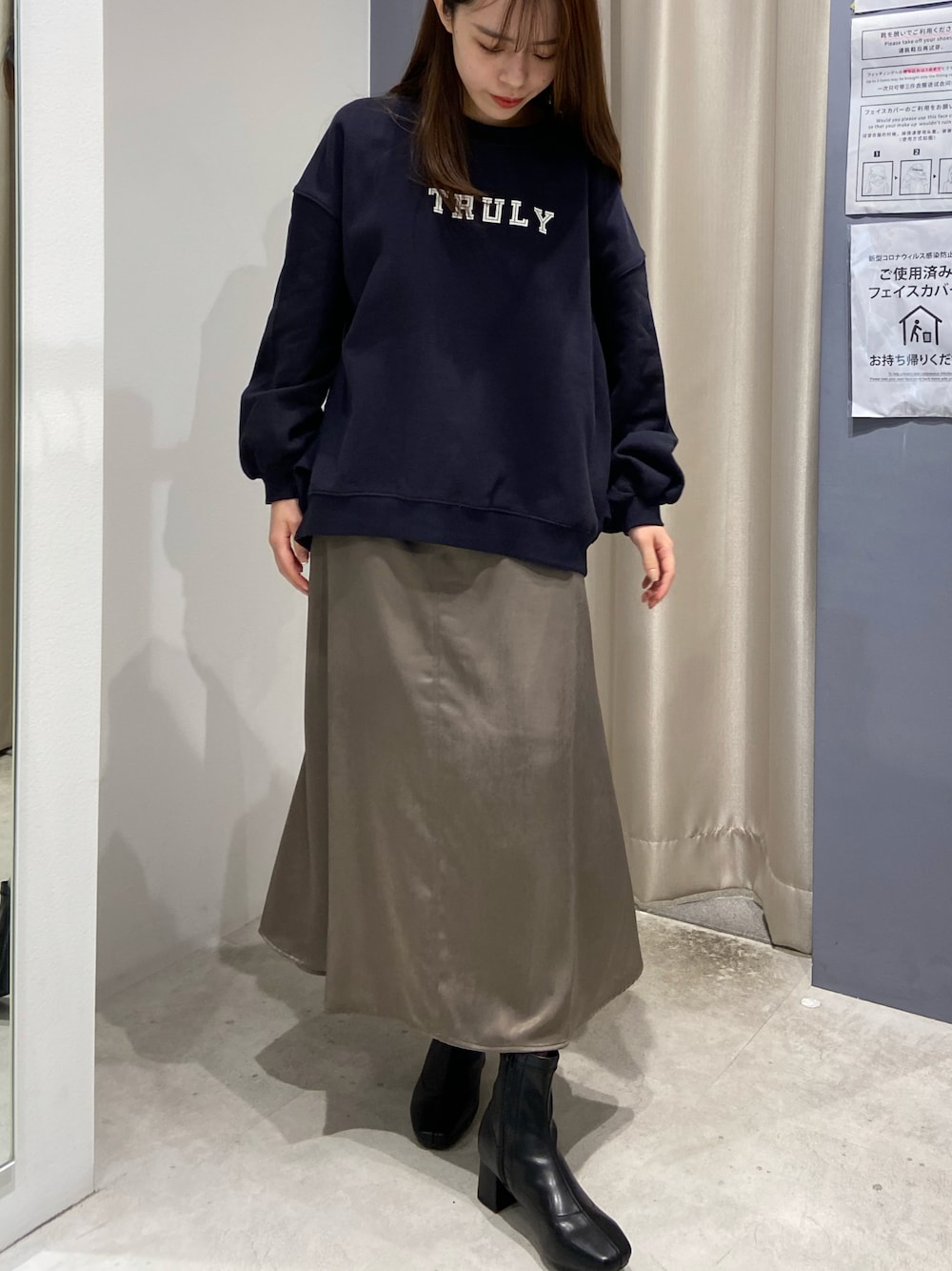 ダークトーンでまとめた大人カジュアルコーデ👣 カジュアルなスウェットは光沢感のあるスカートと合わせれば女性らしい印象になります☺︎