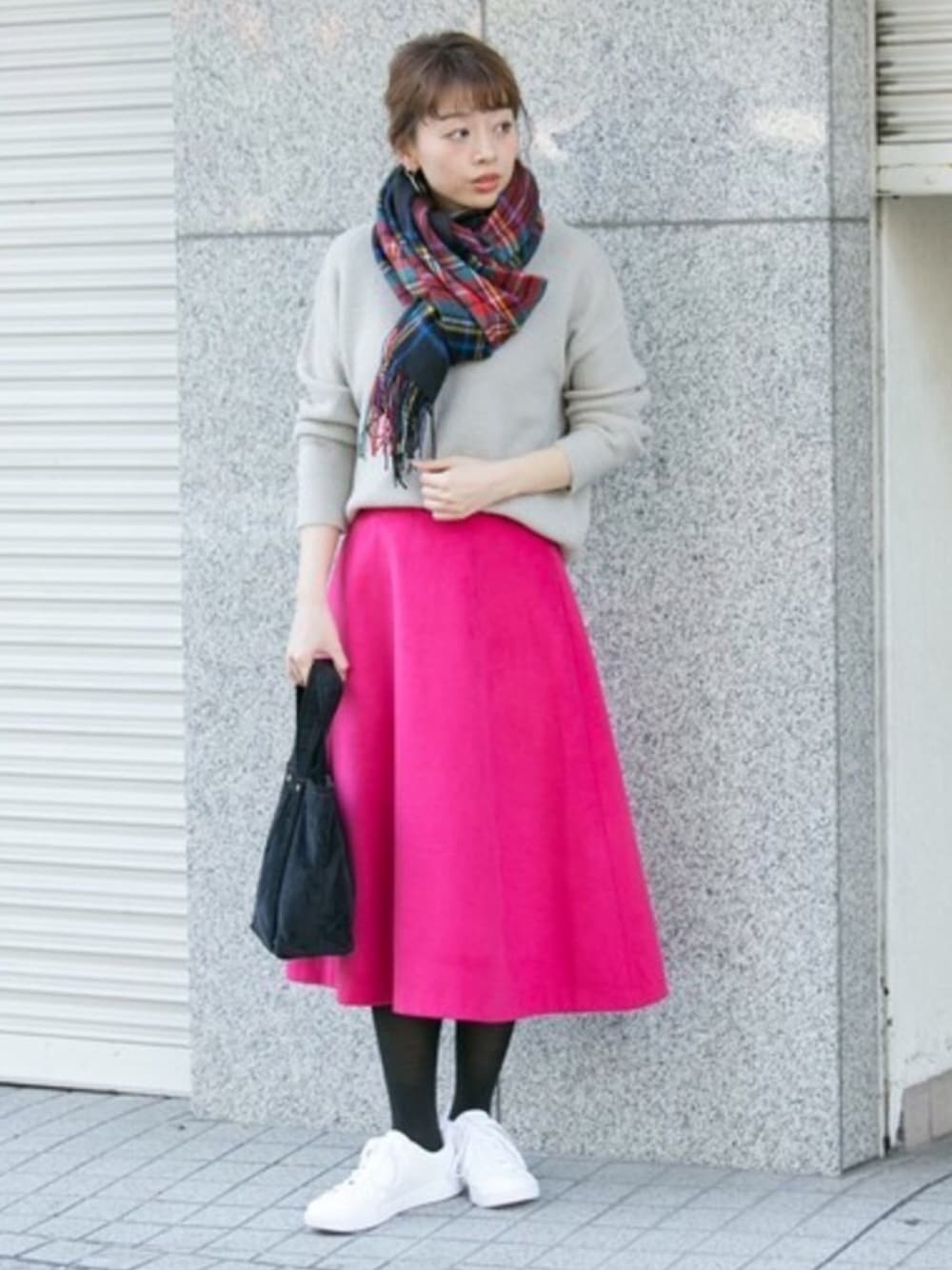 レディライクなピンクのスカートはコーディネートが暗くなりがちな今の季節におすすめです🙆♀️✨ そろそろ肌寒くなってきたのでストールも忘れずに🤗