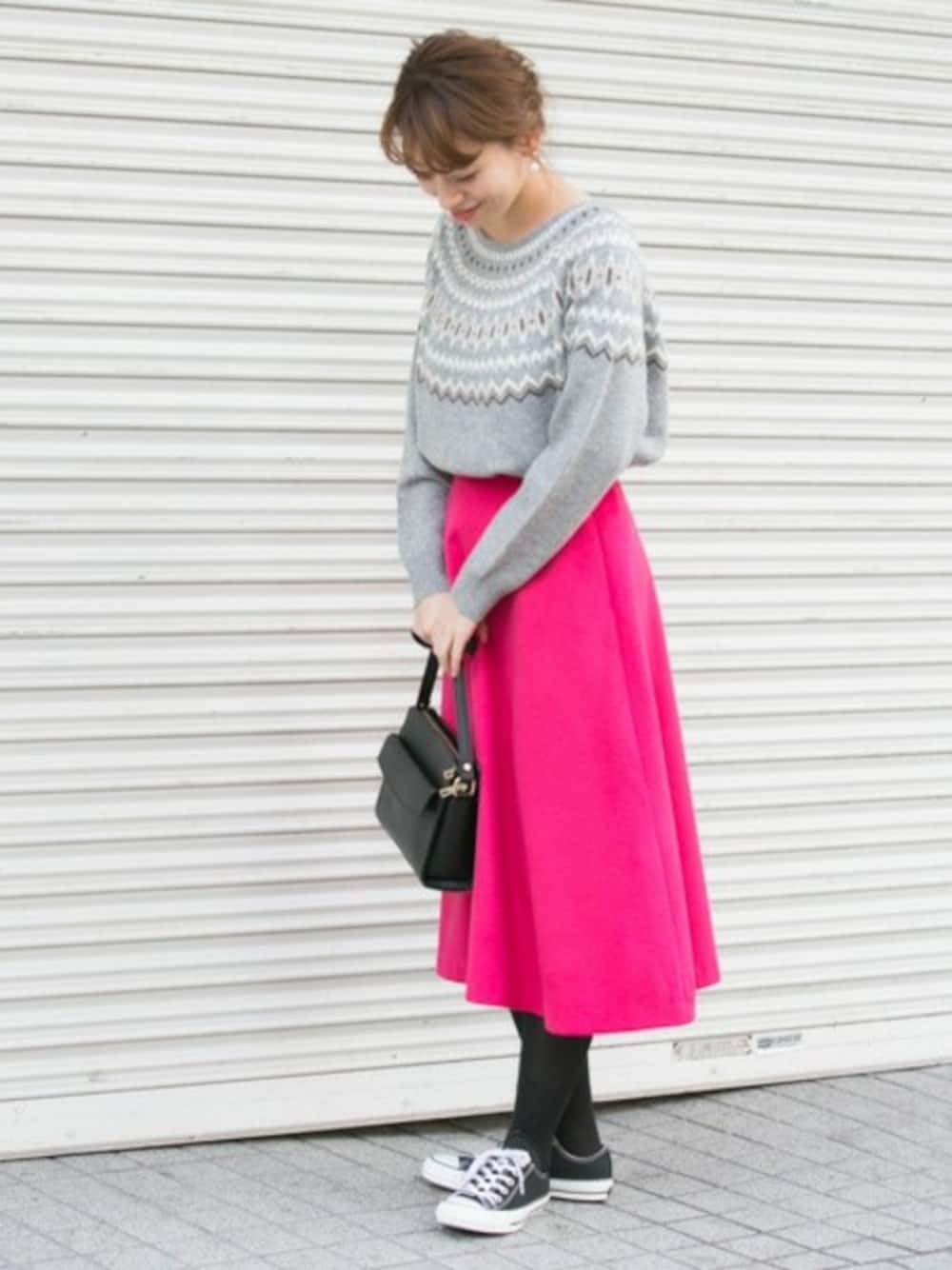 人気の求心柄ニットと派手めピンクが印象的な大人カジュアルスタイル! 求心柄は流行り廃りなく使えておすすめです◎