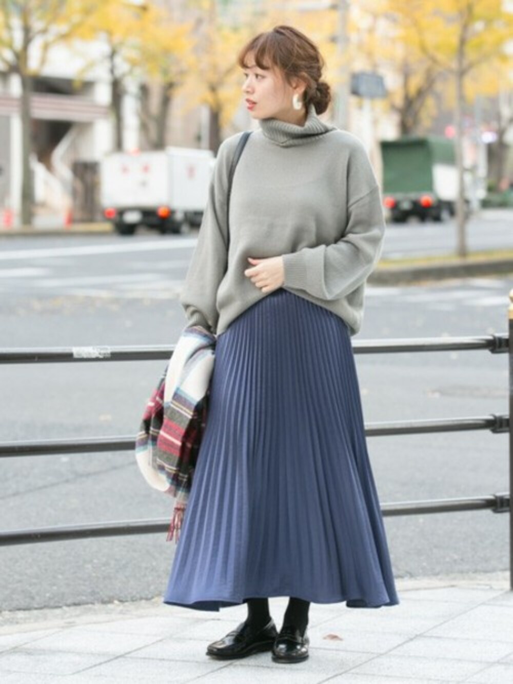 ゆるく柔らかい印象のタートルニットに、光沢感のある大人なプリーツスカート。 カラーはグレー×ネイビーでカジュアルに仕上げたフェミニンスタイル。