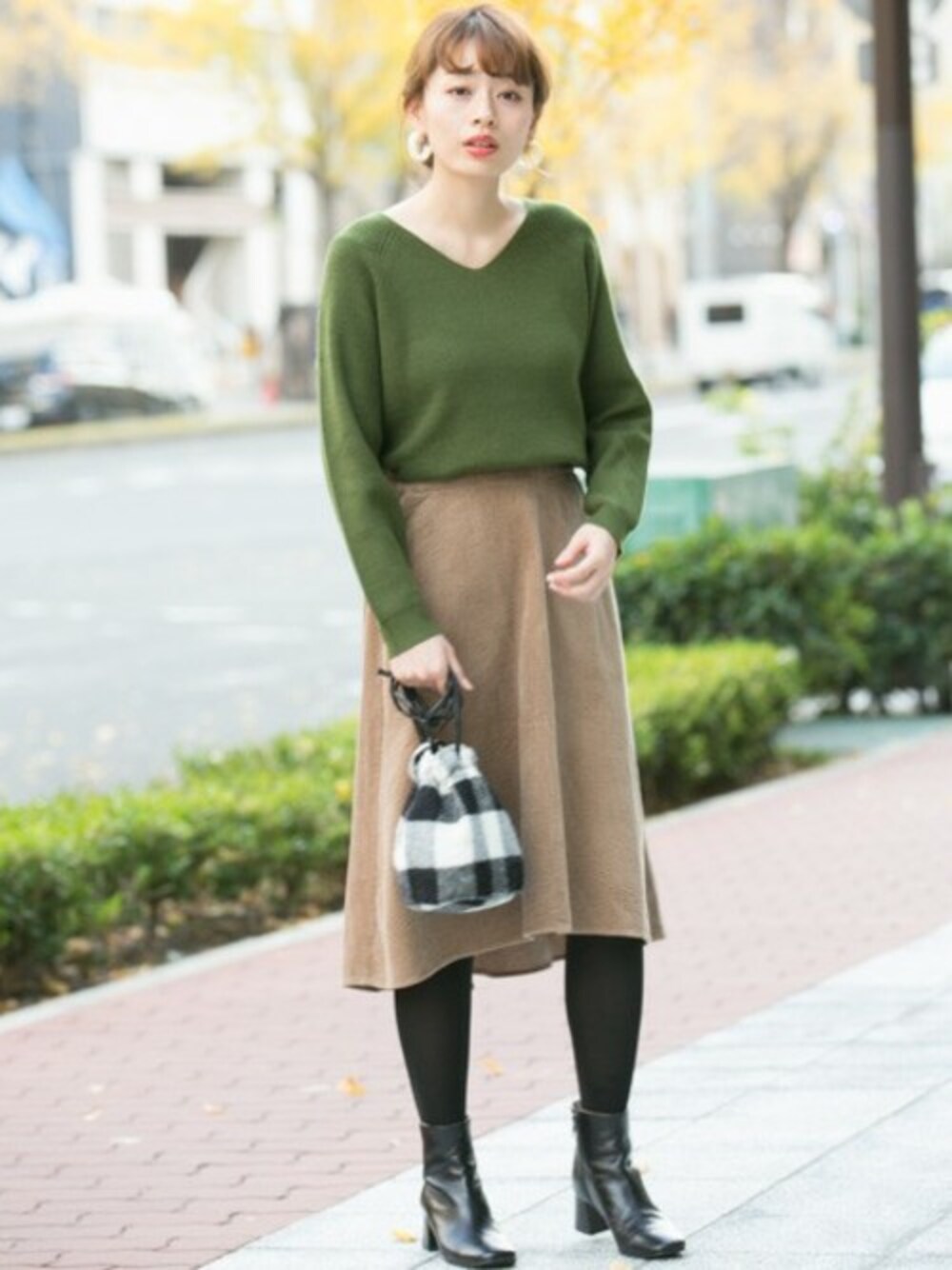 ゆるすぎずタイト過ぎないドルマンニットには、コーデュロイスカートを合わせてカジュアルに。 今季注目のショートブーツをプラスしてさりげない今年っぽさを。