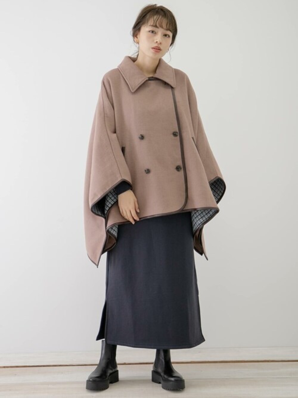 新作のケープを主役にしたコーディネートの紹介です♡ 上品なチェック柄が目を惹く、こちらのケープ。 ゆとりのあるシルエットで、ケープならではのゆったりとした袖口。 着太りすることもなく、ボリュームのあるニットとの相性もばっちりです◎