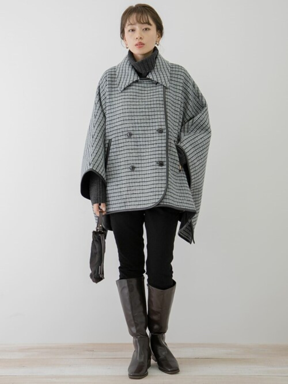 デザイン性抜群のチェック柄ケープコートが入荷しております。 普段シンプルなファッションがお好きな方に 是非一枚重宝して頂きたいアウターになります。