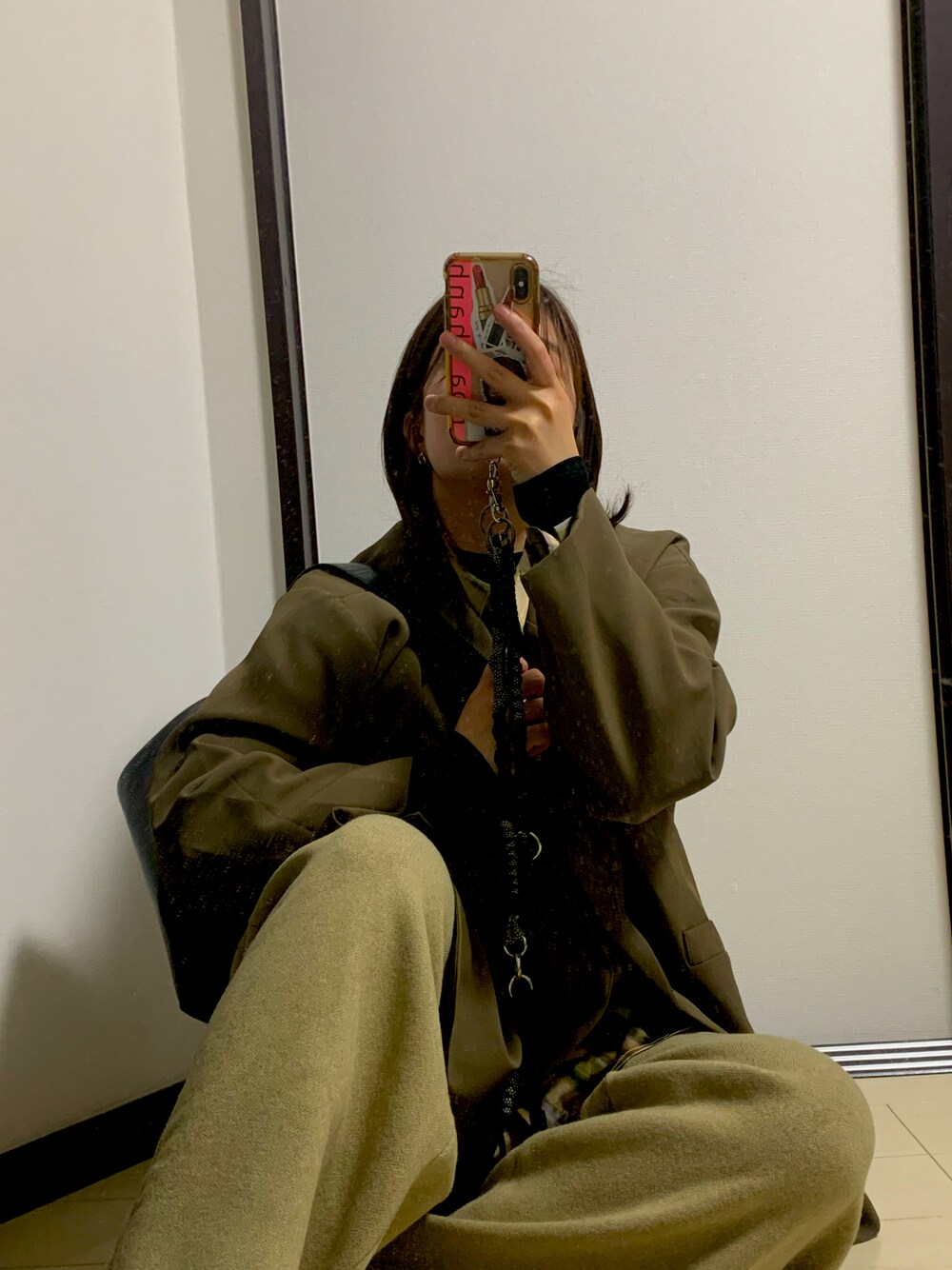 柄シャツにジャケット 中に薄手の黒のニット着てるから暖かい💕 pantsはニット生地なんだけどワイドだから 履き心地最高😃