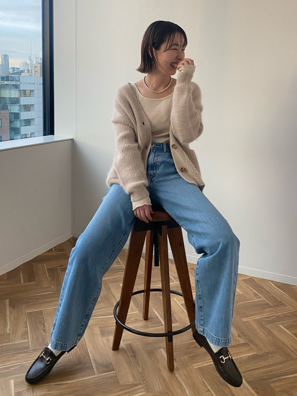 デニムコーデ👖 アンゴラ混で毛足が長いふわふわカーデ、 寒い時期にすっごく重宝しそう、、💖 中に来てるインナーはEWILY WEEKのもの!オーガニックコットンとヤクウールで薄手なのに暖かく優秀です🕊️