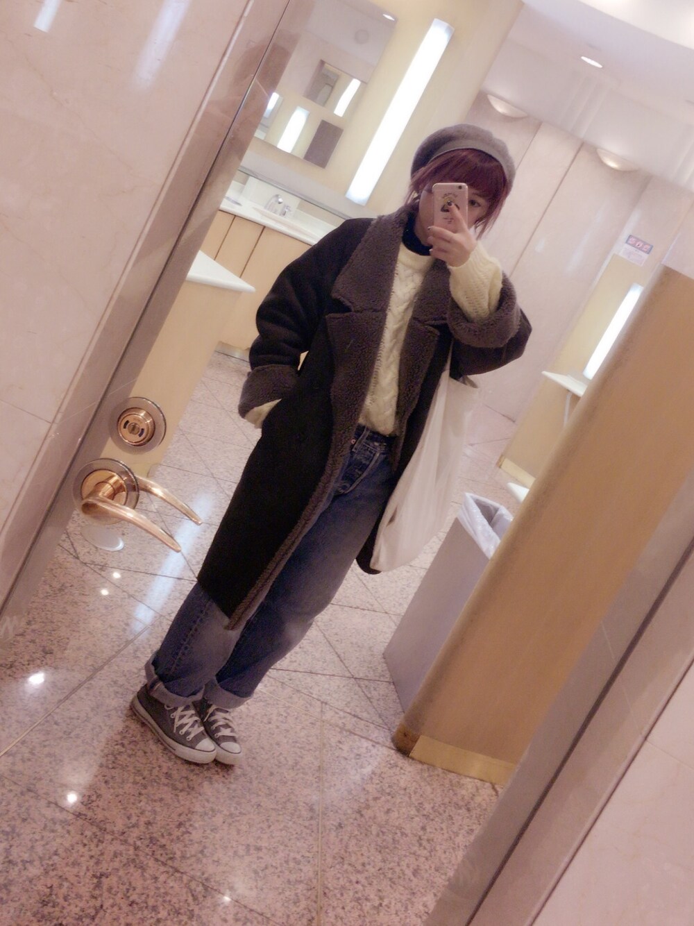 久々のカジュアル😇 とにかく防寒防寒の着膨れコーデだから、 全然寒くなかった(笑) 古着のデニムゆるゆるだったから、トップスのニットinしてみた。 低身長にウエストマーク必須