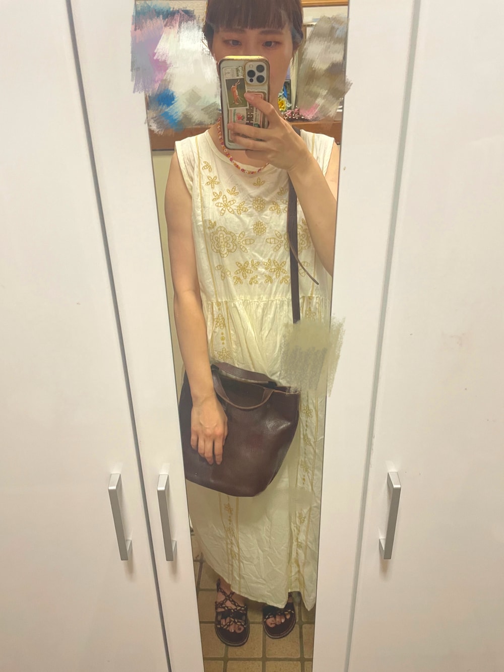 もう10年くらい前?!に買ったワンピース、重ね着しようと思ってなかなか手を出せずにいたやつ。 今まで逞しい二の腕出すの恥ずかしくてノースリーブは外では着なかったんだけど、もうそんなこと言ってられないくらい暑い🫠 白とブラウンでまとめた🤍🤎