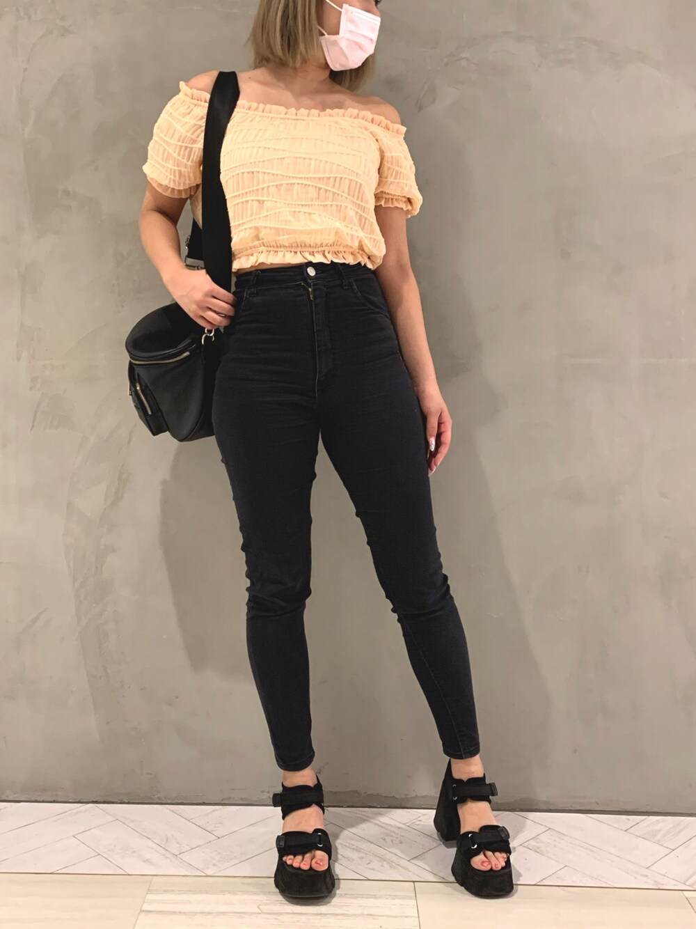 ピンクのシフォンオフショル💓 夏っぽい素材でかわいい💖 甘くなりすぎないように 黒スキニーと合わせました✨👌