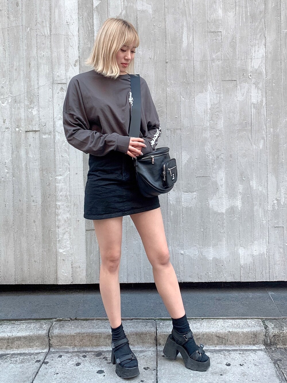 ワントーンコーデ🤍🖤 ダークグレーのロンTにミニスカート合わせ✨ ロンTも少し女の子ぽく着たい気分❤️